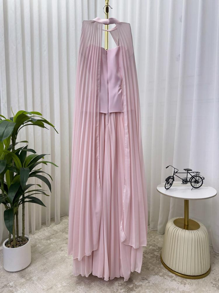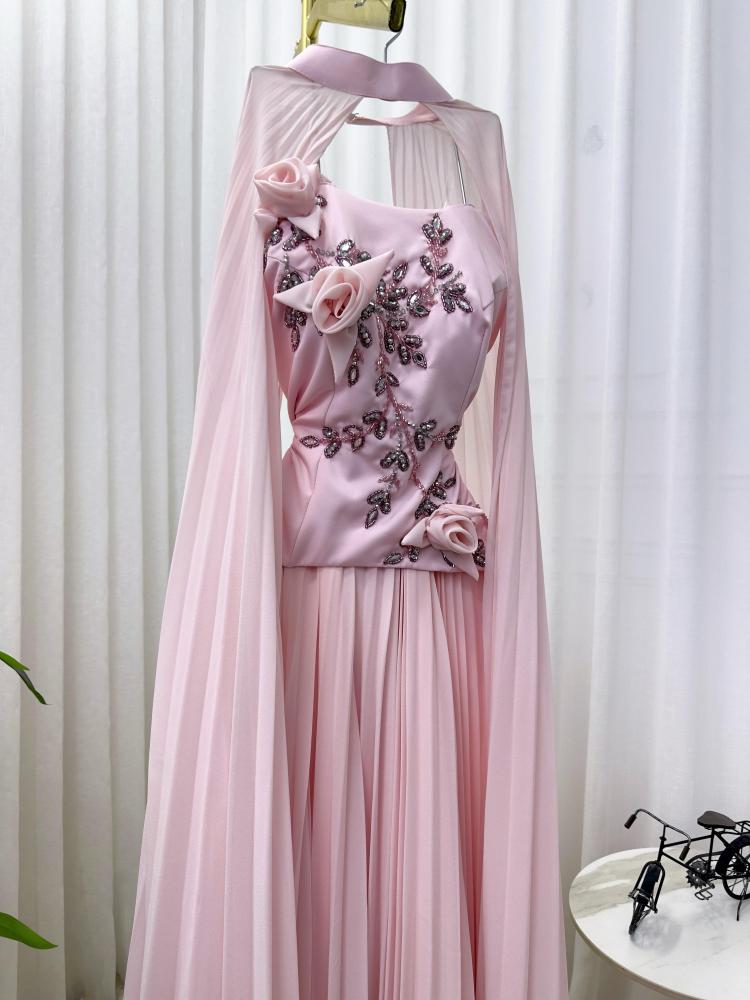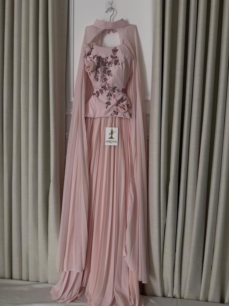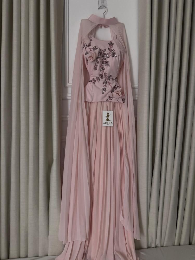 استعدّي لتبهري من حولك بإطلالة أنثوية حالمة مع فستان سهرة وردي بتصميم فريد من قطعتين وشال منسدل يجمع بين الأناقة والنعومة في كل تفصيلة.