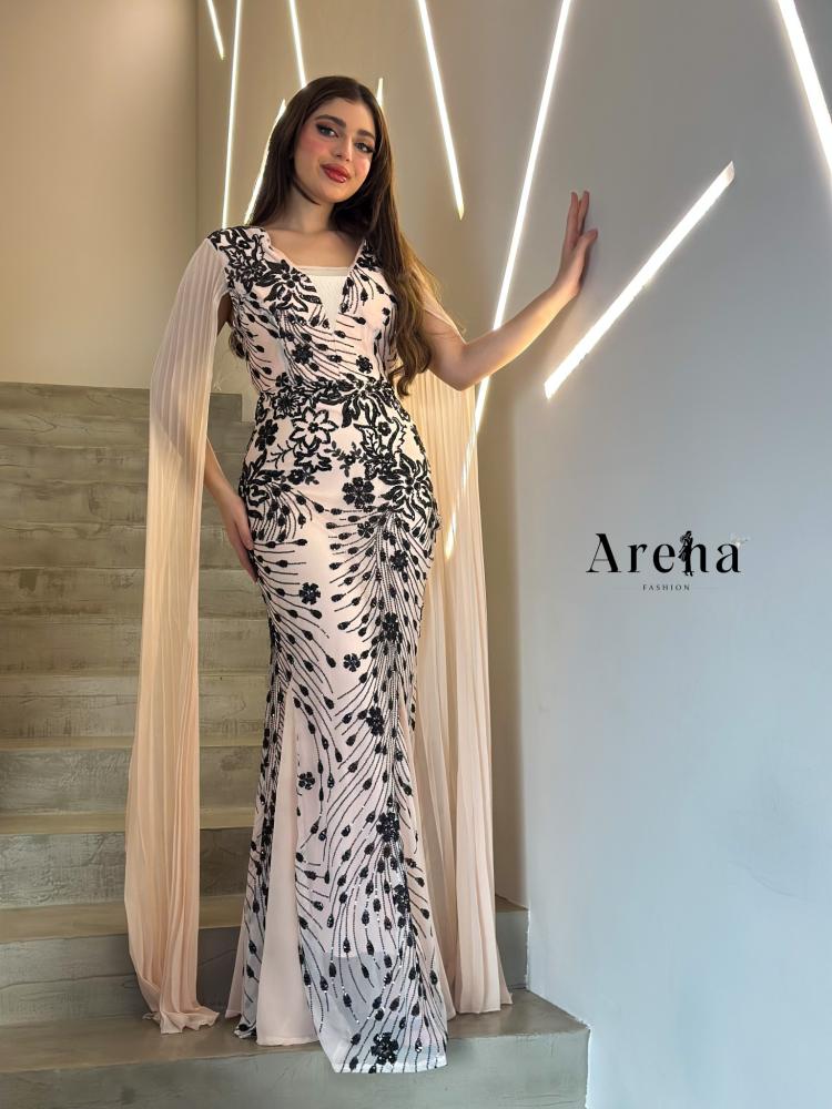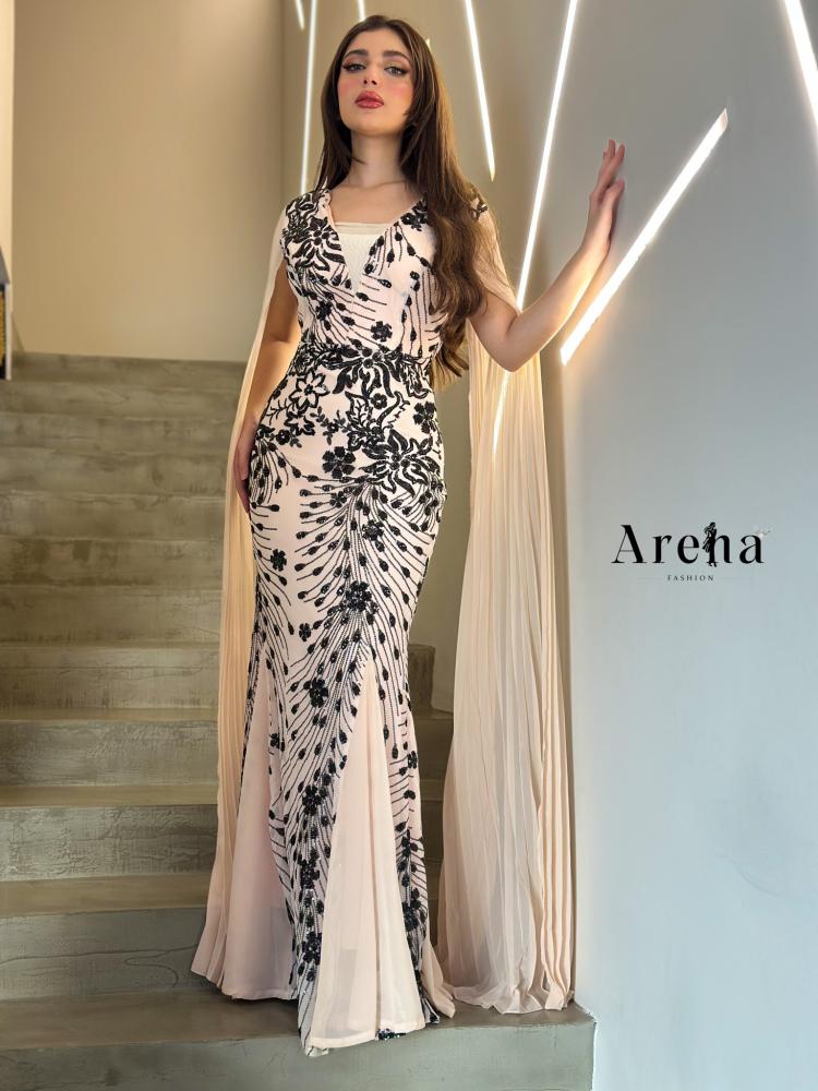 فستان سهره اكمام طويله بليسية مكسر على تطريز ترتر على الفستان قماش كريب شيفون وتل مطرز شك يدوي